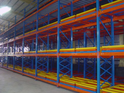 壓入式貨架是在前后梁之間以多層臺車重疊相接,從外側(cè)將托盤(或料箱)置入臺車推入,后儲存的貨物會將原先的貨物推向里面。臺車跨于傾斜軌道上,當(dāng)外側(cè)貨物被取走時,里面的會自動滑下。