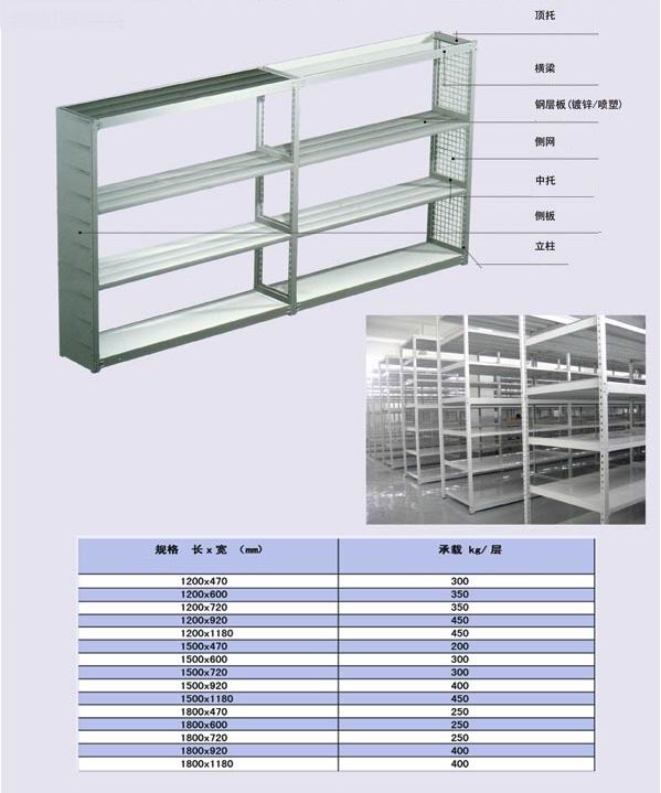 中量A型貨架,中量型貨架,擱板式貨架結(jié)構(gòu)和參數(shù)對(duì)照表