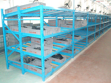 滾輪式料架簡稱流利架,是將貨物置于滾輪上,利用一邊通道存貨,另一邊通道取貨。料架朝出貨方向向下傾斜,貨物在重力作用下向下滑動?蓪(shí)現(xiàn)先進(jìn)先出,并可實(shí)現(xiàn)一次補(bǔ)貨,多次揀貨。流利架存儲效率高,適合大量貨